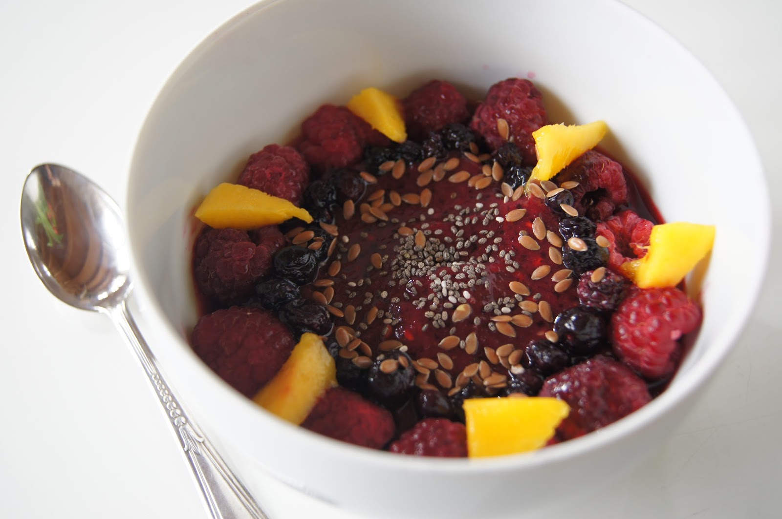 Aber jemand der alles ausprobiert schon, und deswegen habe ich es wirklich gewagt. Da es für die Smoothiebowl kein richtiges Rezept gibt, habe ich einen Apfel, eine halbe Mango, 2 Hände voll Himbeeren und 2 Hände voll Blaubeeren in den Mixer geworfen.